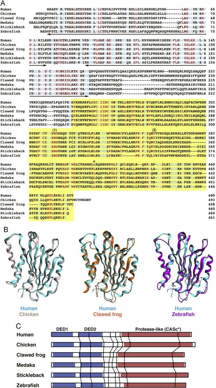 Fig. 1. Analysis of the protein structures of c-FLIP proteins. (A) Multiple alignment of amino acid sequences of human, chicken, African clawed frog, medaka, stickleback, and zebrafish c-FLIP proteins. Identical and similar amino acids in all family members are indicated by red and blue, respectively. The two bold lines and a yellow box indicate the DED motif and the protease-like CASc* domain, respectively. The numbers (1) and (2) shown above the sequences indicate the crucial arginine and tyrosine amino acid residues, which are the cause of the deactivation of the protease activity [8], and an asterisk indicates the conserved leucine residue. (B) Structural superposition of human c-FLIP and non-mammalian c-FLIP proteins. Structural models of the CASc* domain of chicken (light pink), clawed frog (orange), and zebrafish (magenta) c-FLIP proteins were computationally generated and superimposed with the CASc* domain of human c-FLIP (cyan, PDB ID: 3H13). (C) Comparison of the exon-intron organization of the CFLAR genes. The splice junction sites of the CFLAR/c-FLIP genes in vertebrates are indicated by vertical lines. Their positions were defined by the comparison of the respective genomic and cDNA sequences from the species listed in Table A2. The regions corresponding to two DED motifs and a CASc* domain are indicated by blue and red boxes, respectively. |