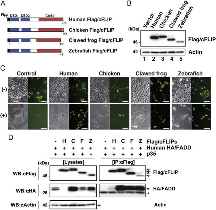 Fig. 4. Assessment of the anti-apoptotic activity of the c-FLIP subfamily proteins. (A) The protein structure of Flag-tagged non-mammalian c-FLIP proteins consisting of two DED motifs and a CASc* protease-like domain. (B) Immunoblot analysis of non-mammalian c-FLIP proteins. The empty vector, pCMV-Flag/HsFLIP, pME18S-Flag/GgFLIP, pME18S-Flag/XlFLIP, or pME18S-Flag/DrFLIP were transiently transfected into HeLa cells. After culturing for 48 h, transgene products were analyzed by immunoblotting with an anti-Flag antibody. (C) Cytological analysis of transfectants expressing non-mammalian c-FLIP proteins. HeLa cells expressing Venus with or without human, chicken, clawed frog, and zebrafish c-FLIP were incubated in the presence (lower panels) or absence (upper panels) of anti-Fas antibody and CHX for 8 h, and examined for viability by monitoring Venus-positive cells. Both phase-contrast and fluorescence images in the same field were captured under the microscope. Scale bars represent 100 μm. (D) Co-immunoprecipitation and immunoblot analysis of physical interactions between non-mammalian c-FLIP proteins and human FADD. Human HEK293 cells were co-transfected with pME18S-HA/hFADD in conjunction with pME18S empty vector, pCMV-Flag/HsFLIP, pME18S-Flag/GgFLIP, pME18S-Flag/XlFLIP, or pME-Flag/DrFLIP. Baculovirus p35 was introduced into all transfected cells to prevent cell death. After 2 days of cultivation, transfected cells were harvested and lysed in lysis buffer. The cell lysates were immunoprecipitated with an anti-FLAG M2 affinity gel. Coimmunoprecipitates and aliquots of cell lysates were examined by immunoblot analysis with anti-Flag, anti-HA, and anti-actin antibodies, respectively. An asterisk indicates immunoglobulin light-chain. Abbreviations: H, human; C, chicken; F, clawed frog; Z, zebrafish; IP, immunoprecipitation; WB, western immunoblotting. |