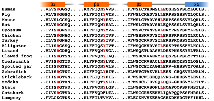 Fig. A1. Multiple alignment of partial amino acid sequences in the CASc* domain of c-FLIP proteins. The conserved arginine (R), tyrosine (Y), and leucine (L) residues are shown in red. The assignments of α-helix and β-sheet secondary structure elements are based on a previous report (see Ref. [30]). |