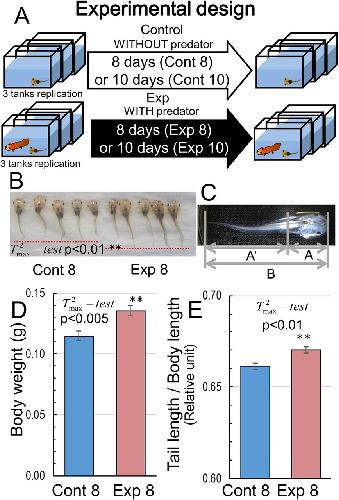 Experimental design and changes in body length and weight in tadpoles exposed to predation. (A) Experimental design of the induced predation in Xenopus tadpoles. Xenopus tadpoles (50 tadpoles per aquarium) were assigned to five different treatment groups. The control group (Cont) was not exposed to the predator for 8 or 10 days of the experiment. The Exp 8 and Exp 10 groups were exposed to the predator for the full 8 and 10 days, respectively. (B) Body length in Xenopus tadpoles exposed to predation. (C) Morphology of Xenopus tadpoles. Tail length was determined as the distance from the anus to the tail top. (D,E) Body weight (D) and the ratio of tail length to body length (E) in tadpoles exposed to predation for 8 days. The number of tadpoles in Cont 8 and Exp 8 was 148 and 97, respectively. Statistical analysis was performed using Krishnaiah’s Embedded Image-test.