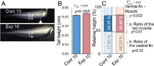 Measurements of tail height, tail muscle and height of the ventral fin. (A) Photographs of tadpoles in the control (Cont 10) and experimental group (Exp 10). Lines indicate tail height, and the lowercase letters a and b indicate height of the tail muscle and height of the ventral fin, respectively. Tail height (B), height of the tail muscle, and height of the ventral fin (C) were measured in 50 tadpoles from each group of tadpoles exposed to predation for 10 days (Exp 10) and the control (Cont 10). These values were obtained at the points of the greatest height of tadpole's tail from images of tadpoles using ImageJ software.