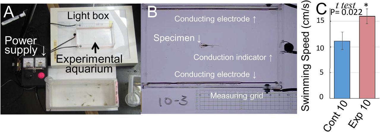 Swimming performance test. Ten tadpoles were randomly chosen from each experimental aquarium, and each tadpole was placed into an experimental electric chamber (A,B). After stabilizing a tadpole's behavior, an electric shock (12â V, 1.5â mA) was delivered to the tadpole for â¼300â ms (B). Swimming behavior of the tadpole was filmed with a high-speed camera at 240 frames/s (Movie 1), and the fast-start swimming speed was analyzed using tadpoles from the control (Cont 10) and the group of tadpoles exposed to predation for 10â days (Exp 10) (C). Statistical analysis was performed using a two-sample t-test after the KolmogorovâSmirnov test.