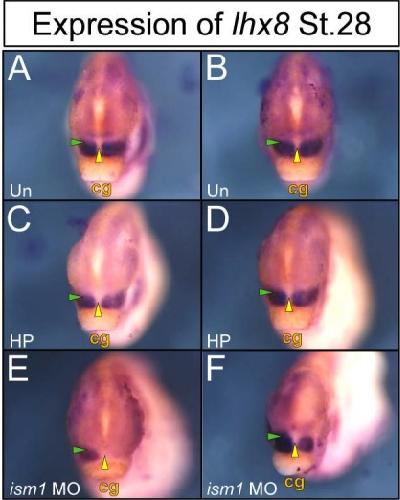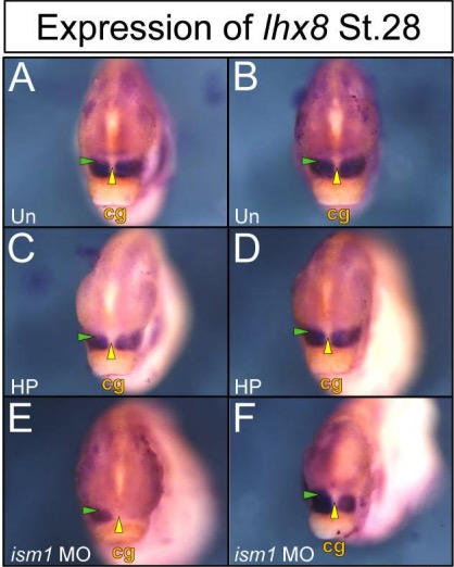 Figure 7: Expression of lhx8 decreases with knockdown of ism1. Embryos are shown in an anterior view with the cement gland (cg) labeled for ventral orientation. Control uninjected (Un) or embryos pricked with the injection needle on half (HP) show strong lhx8 expression in the first branchial arch at stage 28 (A-D) surrounding the primitive mouth (yellow arrowhead) as well as in the maxillary prominences (green arrowhead). Knockdown of ism1 with 12ng ATG MO in half of the animal results in undetectable (E) or decreased (F) branchial arch expression of lhx8, especially in the maxillary prominence.