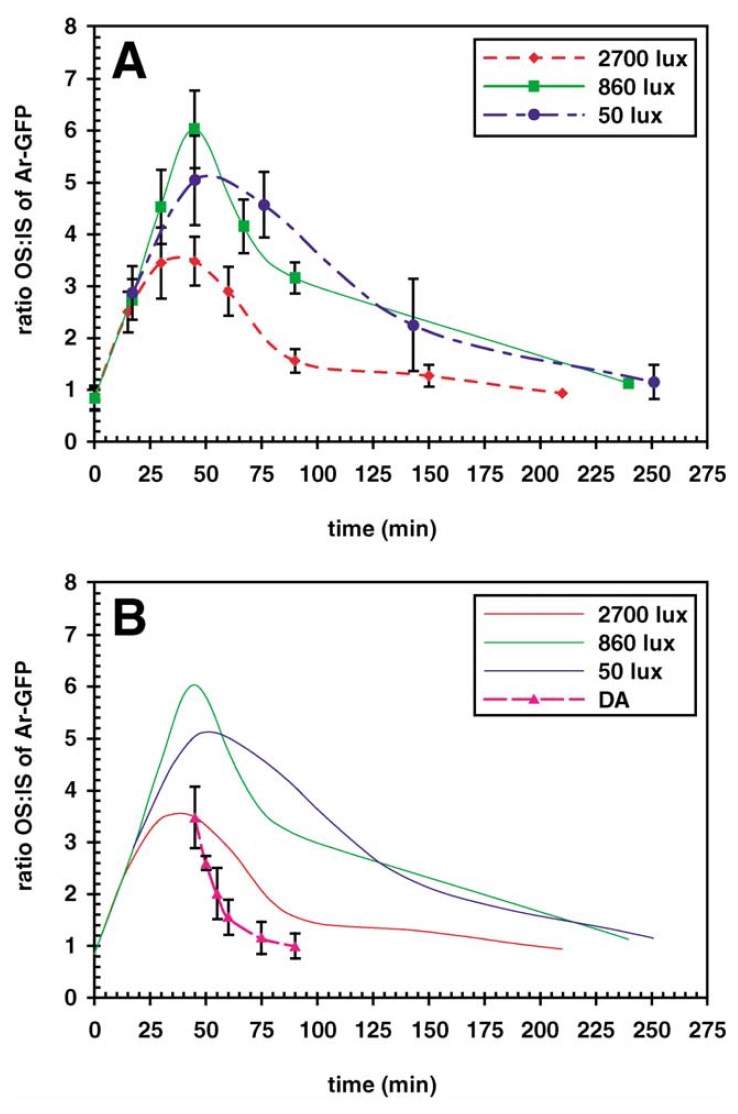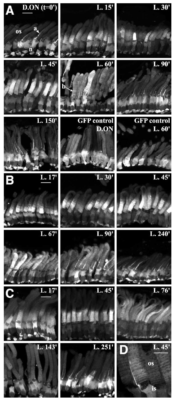 Ar-GFP that were dark-adapted overnight and light adapted for t ¼ 17; 30, 45, 67, 90, or 240 min. (C) Light adaptation at 25â50 lux. Green fluorescent confocal