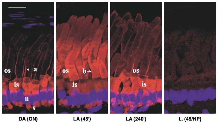 LA (450), and in the IS and axonemes after extended light adaptation LA (2400) at 860 lux. Photoreceptors from retinal sections stained with secondary antibody