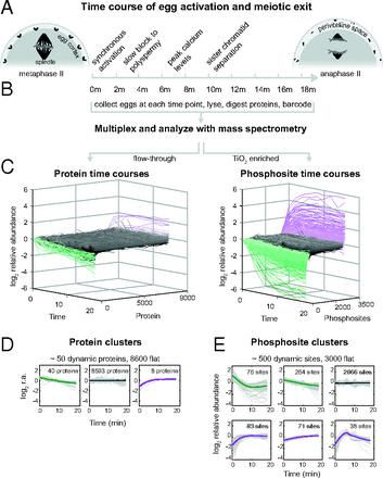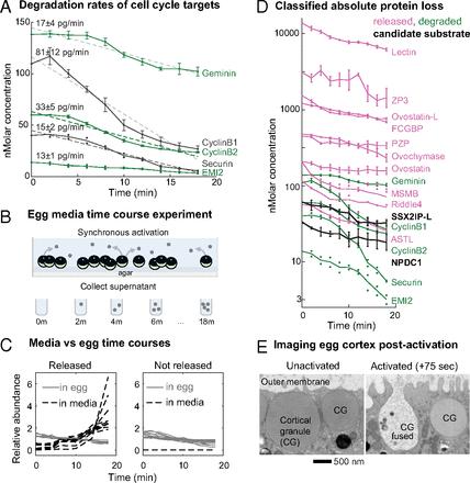 Fertilization releases the meiotic arrest and initiates the events that prepare the egg for the ensuing developmental program. Protein degradation and phosphorylation are known to regulate protein activity during this process. However, the full extent of protein loss and phosphoregulation is still unknown. We examined absolute protein and phosphosite dynamics of the fertilization response by mass spectrometry-based proteomics in electroactivated eggs. To do this, we developed an approach for calculating the stoichiometry of phosphosites from multiplexed proteomics that is compatible with dynamic, stable, and multisite phosphorylation. Overall, the data suggest that degradation is limited to a few low-abundance proteins. However, this degradation promotes extensive dephosphorylation that occurs over a wide range of abundances during meiotic exit. We also show that eggs release a large amount of protein into the medium just after fertilization, most likely related to the blocks to polyspermy. Concomitantly, there is a substantial increase in phosphorylation likely tied to calcium-activated kinases. We identify putative degradation targets and components of the slow block to polyspermy. The analytical approaches demonstrated here are broadly applicable to studies of dynamic biological systems.