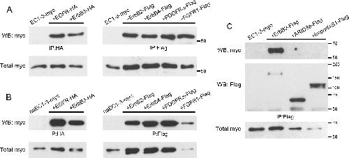 Fig 3. EC1-3-myc and non-adhesive EC1-3-myc interact with growth factor receptors. Western blots of EC1-3-myc (A) and non-adhesive EC1-3-myc (B; naEC1-3-myc) co-immunoprecipitations (coIPs). Receptors were immunoprecipitated using anti-HA or anti-flag antibodies. Both EC1-3 constructs co-IPed with all receptors: HA-tagged EGFR/ErbB1, HA-tagged ErbB3 and flag-tagged ErbB2, ErbB4, PDGFRα and FGFR1. (C) Western blot of EC1-3-myc coIP with cytosolic proteins ARID3a-flag and importinβ1-flag. To test if EC1-3 could interact non-specifically with proteins following extraction we tested Flag-tagged constructs overexpressed in Hek293T cells. EC1-3-myc did not associate with ARID3a-flag, nor importinβ1-flag. ErbB2-flag was used as a positive control. Results are representative of three independent experiments. https://doi.org/10.1371/journal.pone.0188963.g003 |