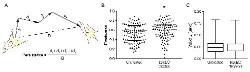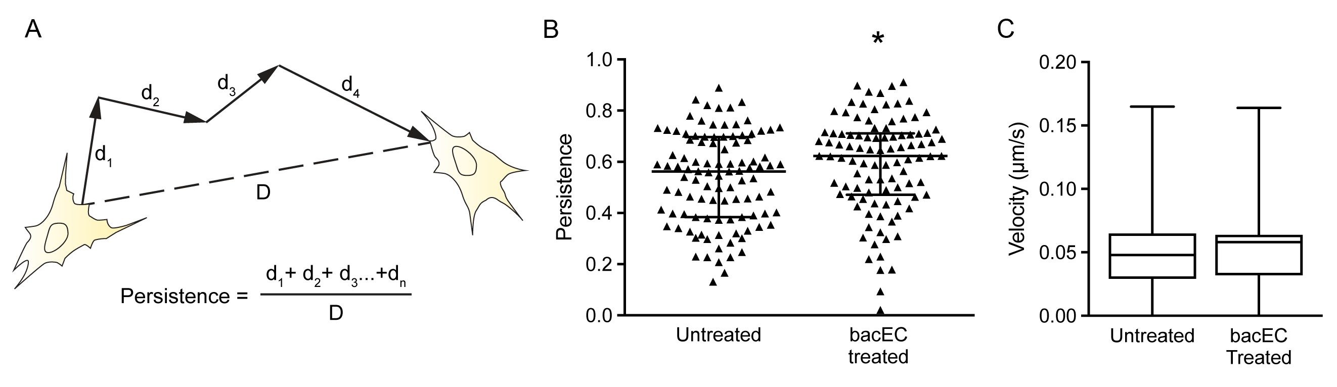 Recombinant EC1-3 increases the persistence of migrating CNC cells. (A) Persistence of cell migration was calculated by adding the distances cells traveled between time points (d) and dividing it by their net displacement (D). (B,C) Quantification of persistence and velocity for untreated and recombinant EC1-3 (bacEC) treated CNC cells. CNC explants were dissected from neurula stage embryos and incubated on fibronectin substrate for at least one hour before being treated with 10 ng/mL bacEC and monitored using time-lapse microscopy. Analysis of cell movement revealed that CNC cells treated with bacEC (N = 3, n = 6, c = 103) have a significantly higher persistence (p = 0.013) than untreated cells (N = 3, n = 6, c = 99). No statistical difference was observed in CNC cell velocity. Scatter plot shows median and interquartile range. One-tailed, Studentâs t-tests were performed to determine statistical significance. * p<0.05. N, number of experiments; n, number of explants; c, number of cells. |