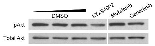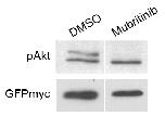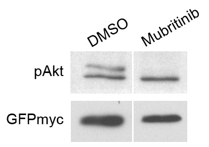Mubritinib inhibits Akt phosphorylation in Xenopus XTC cells. Western blot of XTC cells transfected with X.laevis ErbB2 and GFP-myc, serum starved for 18 hours, and treated with either DMSO or 600 nM mubritinib for one hour. Mubritinib dramatically decreased phosphorylation in one of two Akt isoforms (pAkt) compared to DMSO-treated controls. GFP-myc was co-transfected with ErbB2 to account for variation in transfection efficiency that could result in changes to receptor protein levels. |