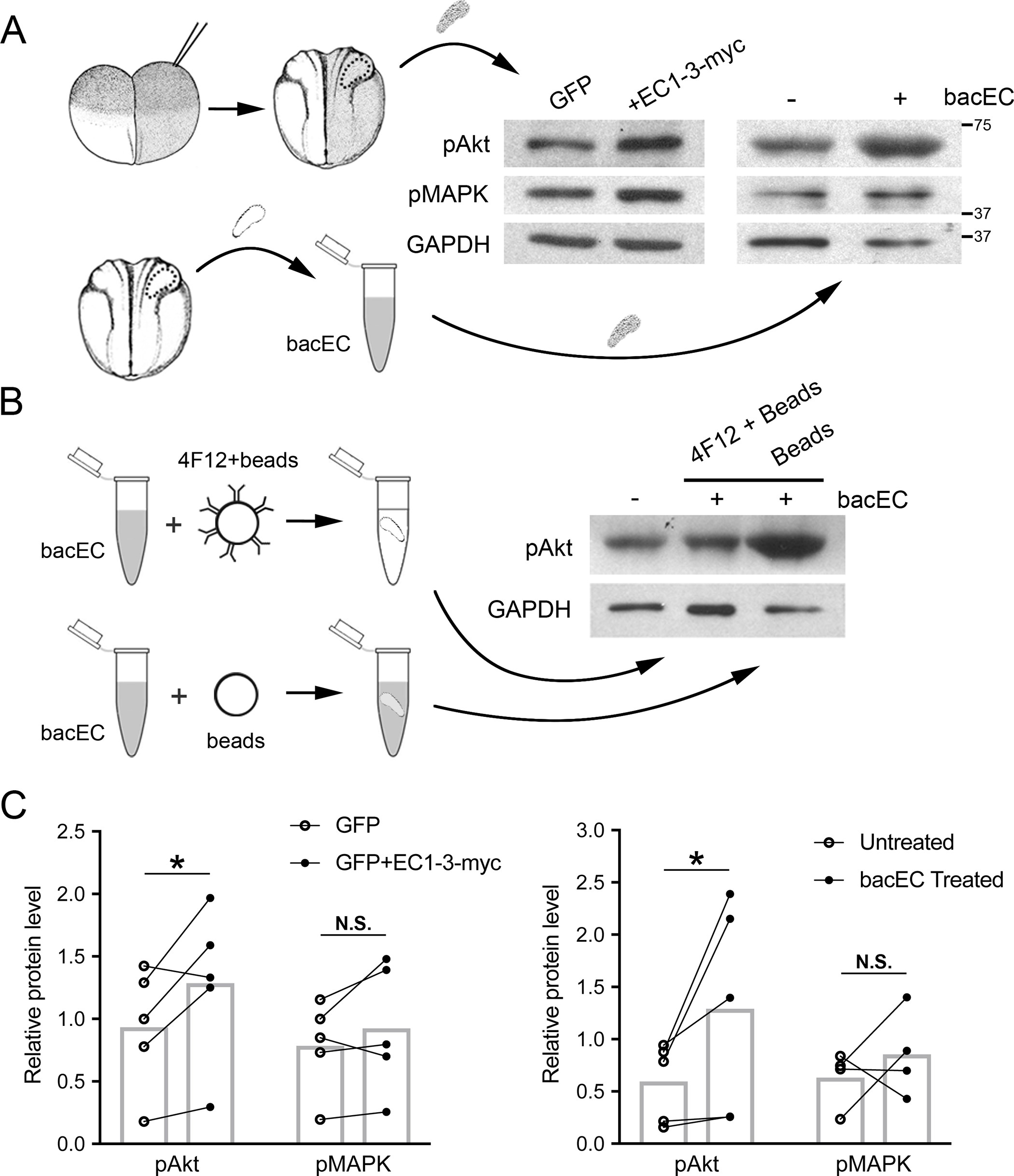 Fig 1. Overexpression of EC1-3-myc and treatment with recombinant EC1-3 increases Akt phosphorylation. (A, upper) Injections of 200 pg mRNA for UGP alone or together with 800 pg of EC1-3-myc mRNA were performed on single blastomeres of 2-cell X.laevis embryos. CNC expressing UGP were dissected at neurula stages, lysed and analyzed for phospho-Akt (pAkt), phospho-MAPK (pMAPK) and GAPDH via western blot. (A, lower) Non-injected CNC were dissected and treated for 5 minutes with 10 ng/mL of recombinant EC1-3 (bacEC) before being processed as above. (B) As a control, bacEC was depleted from treatment solution using a specific bacEC antibody conjugated to agarose beads and then applied to CNC. Lysates were then analyzed as above. Immunodepletion using unconjugated beads was used as a control. (C) Significant increases in phospho-Akt were observed in CNC overexpressing EC1-3-myc (N = 5, p = 0.013) and those treated with bacEC (N = 5, p = 0.021). There were not significant (N.S.) increases in the phosphorylation of MAPK in CNC overexpressing EC1-3-myc (N = 5, p = 0.09), nor those treated with bacEC (N = 5, p = 0.178). GAPDH was used as a loading control for western blots and normalizer for calculation of phospho-Akt and phospho-MAPK. Error bars are one standard deviation to the mean. One-tailed, Studentâs t-tests were performed to determine statistical significance. * p<0.05. N, number of experiments. https://doi.org/10.1371/journal.pone.0188963.g001 |