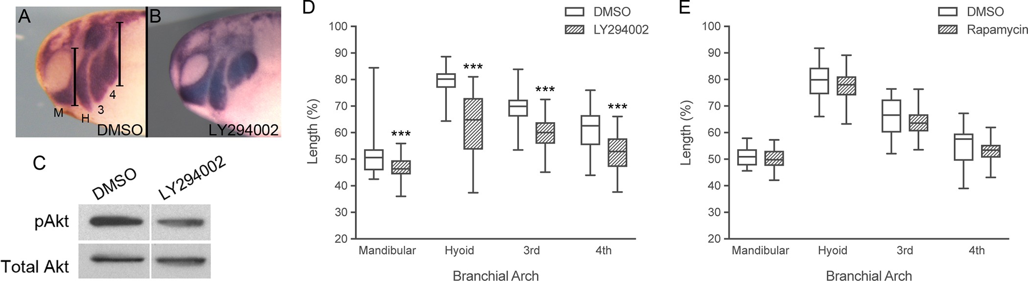 Fig 2. Inhibition of PI3K perturbs CNC migration. (A,B) Lateral views of tailbud stage X.laevis embryos after in situ hybridization with Sox10 and Twist to visualize CNC positioning. Anterior is to the left, dorsal is up. Migration of CNC cells into the branchial arches is perturbed in embryos treated with 30 μM LY294002 (N = 4, n = 52). (C) Western blot of embryos treated with DMSO or 30 μM LY294002. Embryos treated from stage 17â18 to stage 25â26 with LY294002 had reduced levels of phosphorylated Akt (pAkt). One-embryo equivalents were loaded per well. (D,E) The length of CNC migration (shown in A) in each branchial arch was quantified and normalized to head size. LY294002 significantly reduced CNC migration into all branchial arches compared to DMSO controls (N = 4, n = 66). Treatment with 40 μM rapamycin (N = 4, n = 37) did not noticeably alter CNC positioning compared to DMSO controls (N = 4, n = 35, respectively). CNC cells migrated into the mandibular (M), hyoid (H), 3rd and 4th branchial arches. Ruler bars denote how CNC segments were measured. Error bars are one standard deviation to the mean. One-tailed, Studentâs t-tests were performed to determine statistical significance. *** p<0.001. N, number of experiments; n, number of embryos. https://doi.org/10.1371/journal.pone.0188963.g002 |