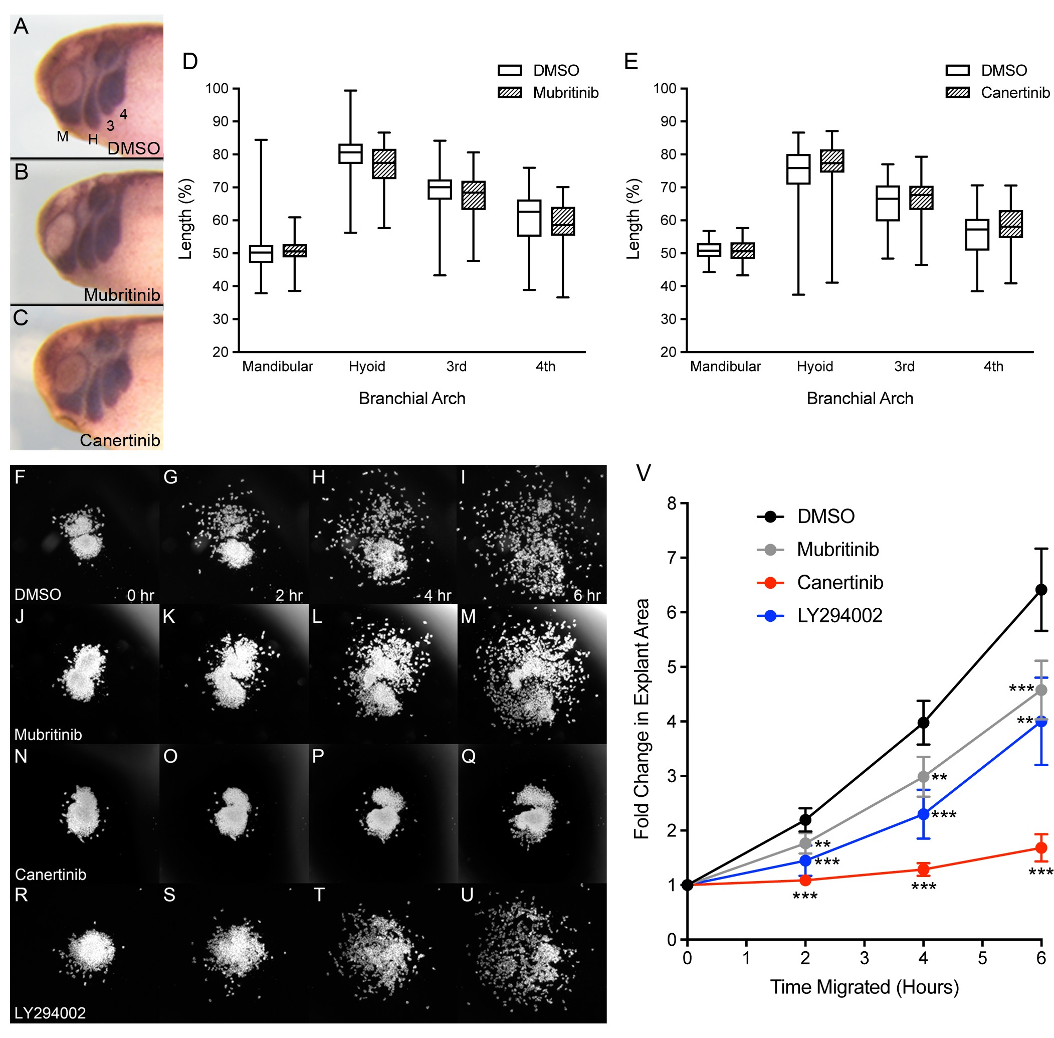 Fig 7. Mubritinib and canertinib perturb CNC migration ex vivo. (A-C) Lateral views of tailbud stage X.laevis embryos after in situ hybridization with Sox10 and Twist to visualize CNC positioning. Anterior is to the left, dorsal is up. Embryos treated with 40 μM of the ErbB2 inhibitor, mubritinib (N = 4, n = 72), or 25 μM of the pan-ErbB inhibitor, canertinib (N = 4, n = 68), show no difference in CNC migration compared to DMSO controls (N = 6, n = 100; N = 4, n = 69, respectively). (D-E) The distance of migration within each branchial arch was measured and normalized to the head size. CNC migration as observed in the mandibular (M), hyoid (H), 3rd and 4th branchial arches. (F-U) Time-lapse images of CNC explants migrating on fibronectin substrate and treated with 0.5% DMSO (N = 8, n = 24), 6 μM mubritinib (N = 4, n = 12), 10 μM canertinib (N = 4, n = 12), and 20 μM LY294002 (N = 3, n = 9) for indicated lengths of time. (V) Fold change in explant surface area over time. Areas were normalized to measurements calculated at initial time points (t = 0). All inhibitors significantly decreased CNC migration ex vivo. Error bars represent the 95% confidence interval. One-tailed, Studentâs t-tests were performed to determine statistical significance. ** p<0.01, ***p<0.001. N, number of experiments; n, number of embryos or explants. https://doi.org/10.1371/journal.pone.0188963.g007 |