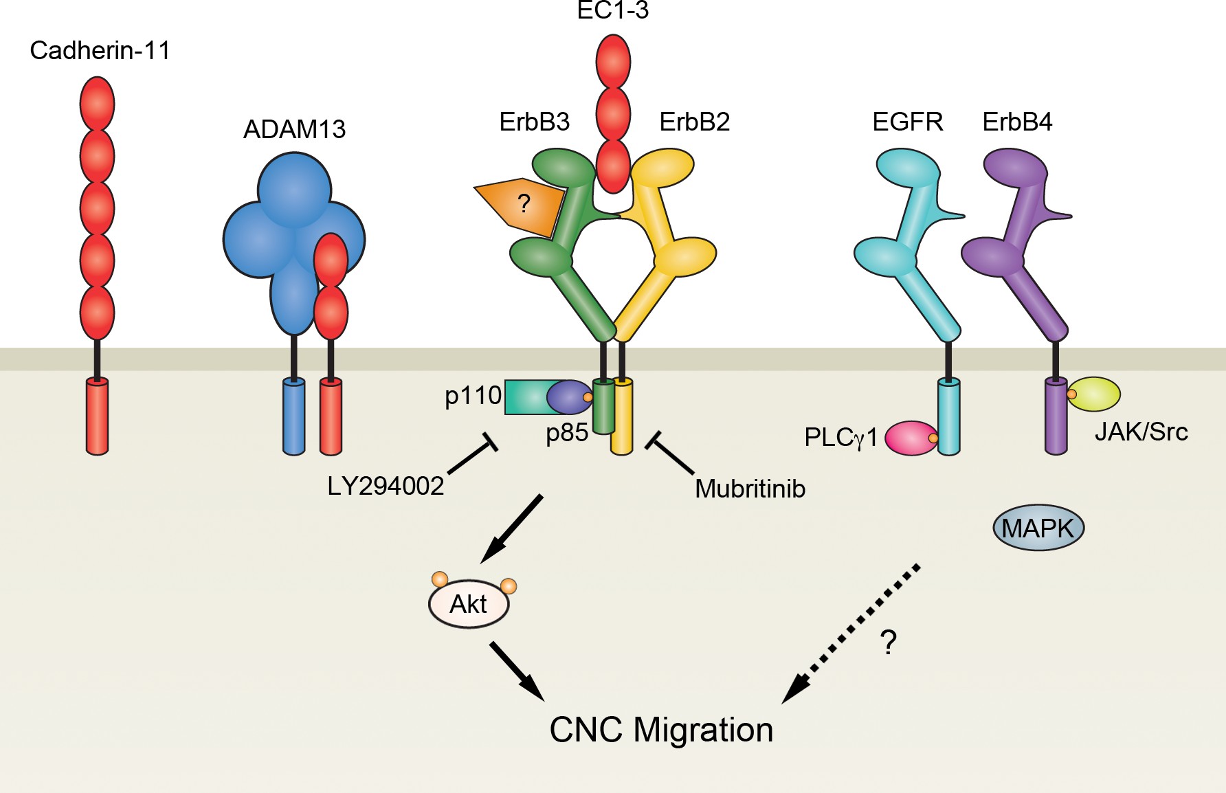 The ectodomain of cadherin-11 binds to erbB2 and stimulates Akt phosphorylation to promote cranial neural crest cell migration.