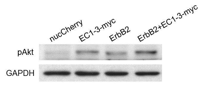 Co-expression of EC1-3 with ErbB2 increases Akt phosphorylation in vitro. Hek293T cells were transfected with a nuclear-localized RFP (nucCherry), EC1-3-myc, ErbB2, or a combination of EC1-3-myc and ErbB2. Cells were then serum starved for at least 18 hours and lysed for western blotting. GAPDH was used as a loading control. Results are representative of three independent experiments. |