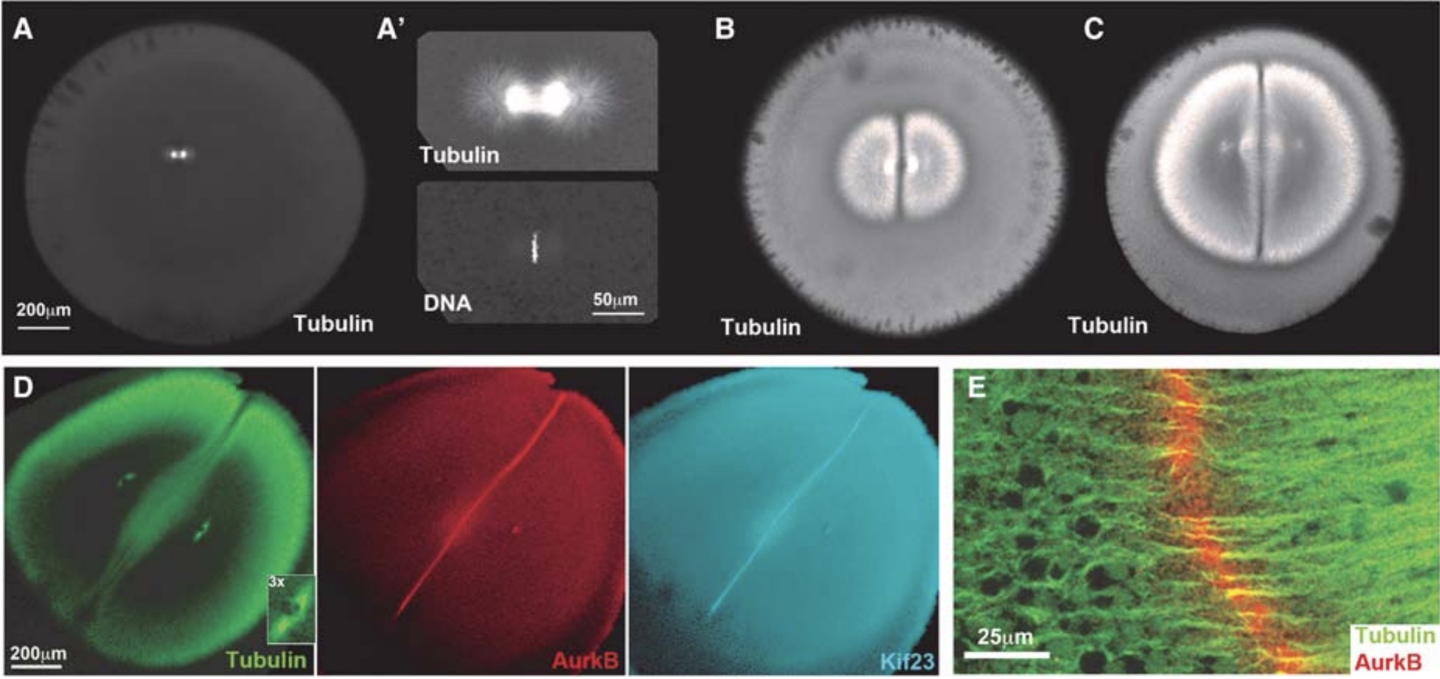 these images. (A,A′) Egg fixed ∼60 min after fertilization, at metaphase of first mitosis. Note the spindle is small compared to the egg. (B,