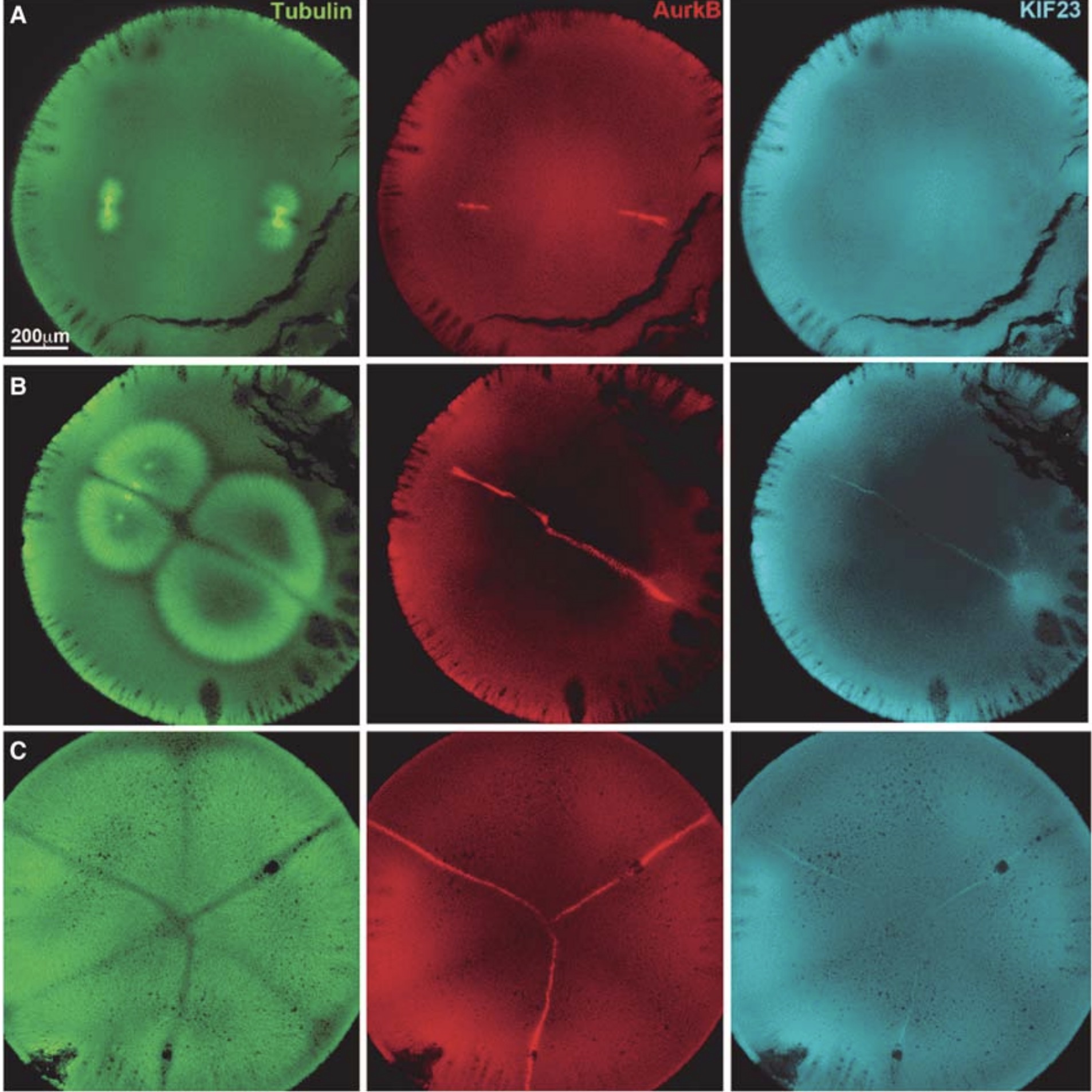 initiation, ∼90 min after fertilization. The asters are just touching the cortex at the animal pole. AurkB is a subunit of the CPC; Kif23 is a