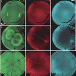 first cleavage, with confocal sections oriented as in Figure 2. Cleavage has just initiated at the animal pole in C. The eggs in A and B were