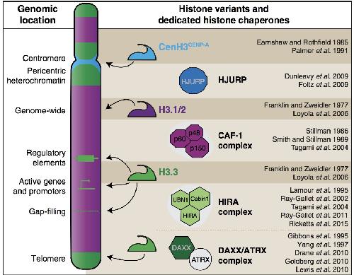 Figure 2. Histone variants (bricks) and their associated histone chaperones (architects) mark specific chromosomal regions. Among H3