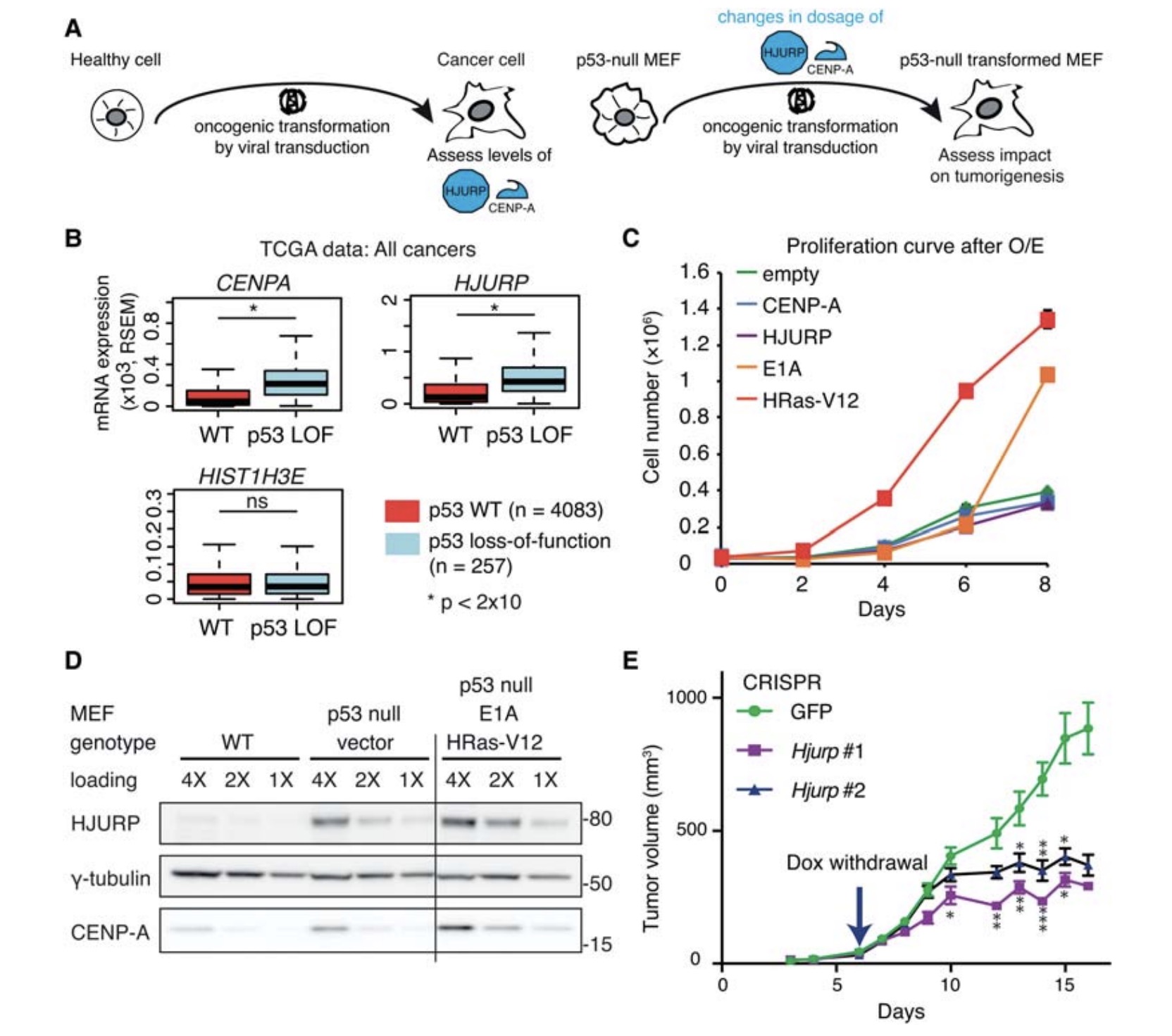 expression (mRNA) of genes coding for CENP-A (CENPA), HJURP (HJURP), and H3.1 (HIST1H3E) from all cancers (28 cancer types), classified according to p53 status (TCGA provisional data). Tumors are either wild type for TP53 (n = 4083) or p53 loss of function (LOF) (n = 257). Significance was computed using Wilcoxon rank sum tests. (C) HJURP or CENP-A overexpression alone does not transform p53-null MEFs. Proliferation curve of p53-null MEFs transduced with the indicated retroviral construct. The graph displays the quantified cell number ± SEM of triplicates. (D) HJURP and CENP-A are overexpressed in p53-null wild-type and transformed MEFs. Western blot of HJURP and CENP-A levels in RIPA-soluble extracts from MEFs transduced with empty vector or sequentially with E1A and HRas-V12. (E) Conditional depletion of exogenous HJURP stops the growth of established tumors lacking endogenous HJURP. Allograft assay measuring tumor growth following HJURP knockout over time. p53-null HRas-V12 MEFs were generated with an inducible CRISPR-resistant HJURP transgene maintained in the presence of doxycycline. Doxycycline was withdrawn on day 6 after injection (Hjurp switched off ) and allograft tumor volume was measured over time. Data represent mean tumor volume ± SEM. *, P < 0.05; **, P < 0.005; ***, P < 0.0005, t-test. (Adapted, with permission, from Filipescu et al. 2017.) |