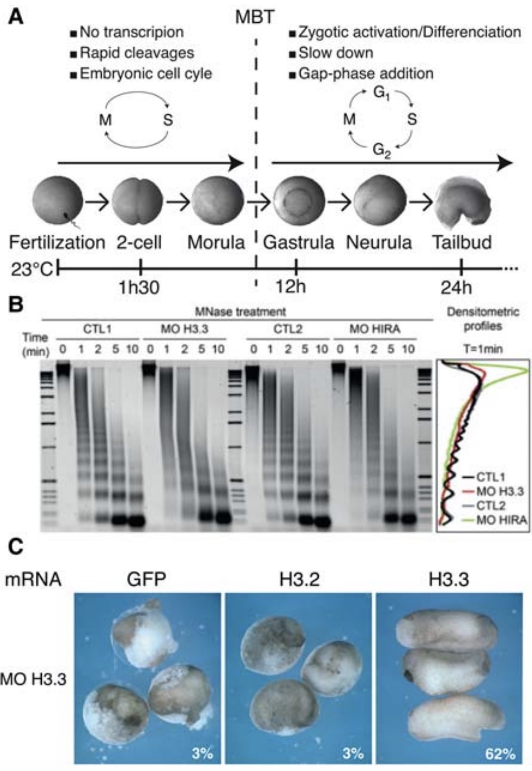 2012). Depletion of endogenous H3.3 impairs cellular viability leading to gastrulation defects. Histone chaperone HIRA knockdown gives rise to similar phenotypes, implicating the DNA synthesis-independent H3.3 incorporation pathway during development. (A, Adapted, with permission, from Lacoste et al. 2014;