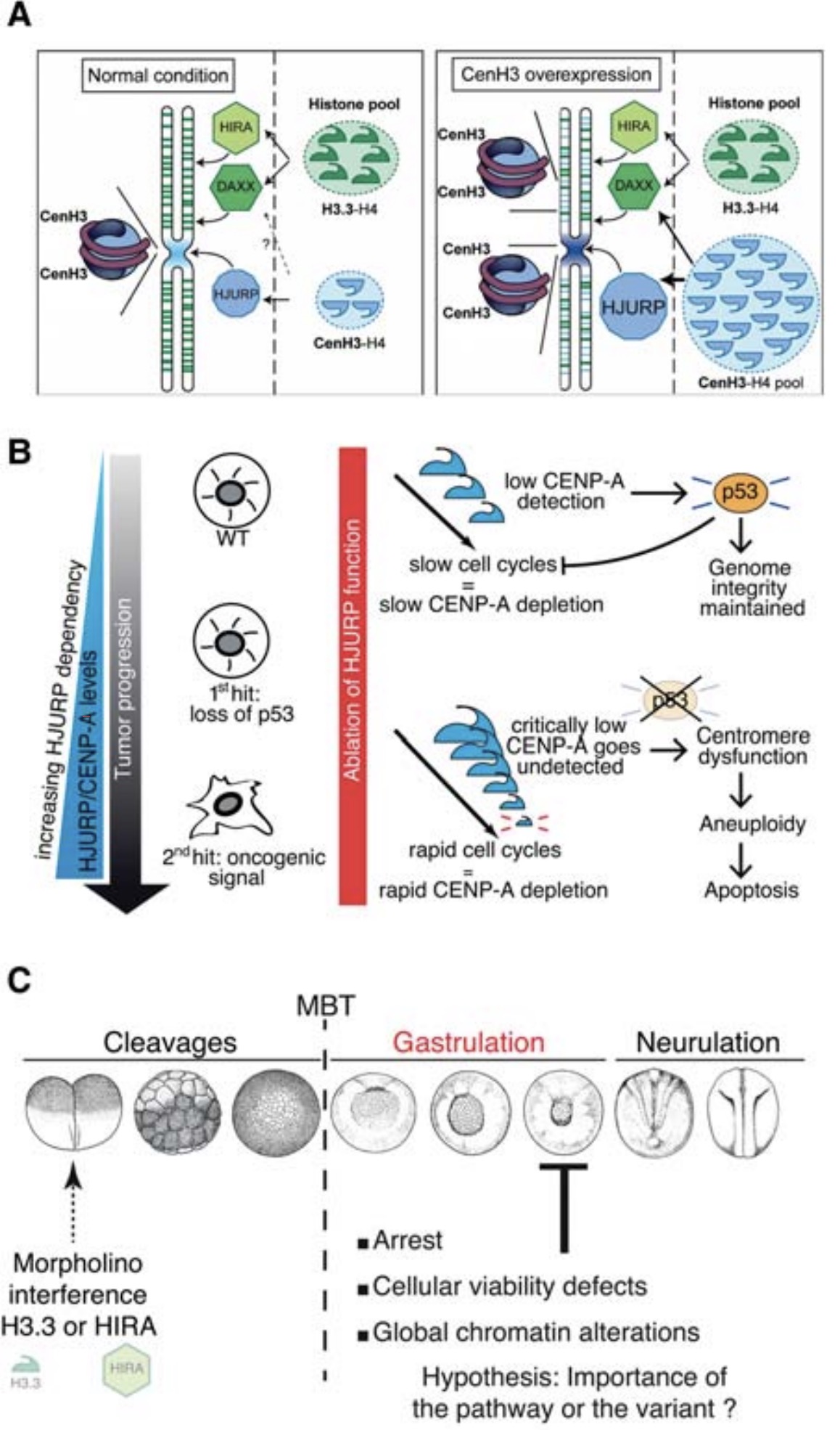 levels of HJURP. If HJURP is depleted in this context, it leads to massive aneuploidy and apoptosis. Thus, tumors become addicted to the high level of HJURP in the absence of p53. (C) In Xenopus laevis, selective loss of H3.3 variant causes global chromatin dysregulation during early development (Szenker et al.