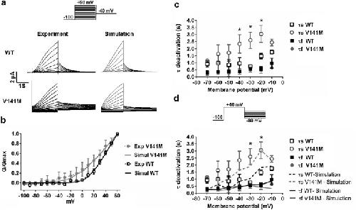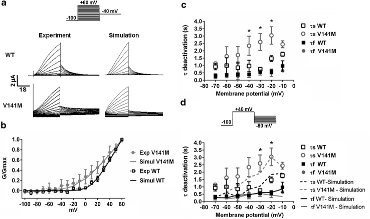 Fig. 1. V141M KCNQ1 affects activation kinetics and voltage dependence of IKs. a Currents of WT KCNQ1/KCNE1 channels (WT IKs) and heterozygous V141M KCNQ1/KCNE1 channels (V141M IKs) expressed in Xenopus oocytes (left panels). The currents were elicited by test pulses to +60 mV from a holding potential of −100 mV. Tail currents were measured at −40 mV for WT and V141M IKs. The WT and V141M IKs were simulated using a Markov model (right panels; see supplementary materials). b V141M KCNQ1 mutation caused a leftward shift of the conductance–voltage curve (V1/2 = 33.6 ± 4.0 mV for WT, 24.0 ± 1.3 mV for heterozygous V141M; n = 5 for each). Simulation results (solid lines) are consistent with the experimental data (dashed lines). c Voltage dependence of activation and deactivation time constants (τ) of WT and heterozygous V141M IKs (n = 5 for each). τ activation was obtained from fitting the activating current traces with a double exponential function. V141M KCNQ1 causes faster activation of IKs (*p < 0.05 for τ1 and #p < 0.05 for τ2; V141M vs WT; n = 3 for each). d V141M KCNQ1 causes slower deactivation of IKs (*p value <0.05 for τs; V141M (n = 5) versus WT (n = 3). τ deactivation was obtained from fitting the deactivating current traces with a double exponential function. Lines indicate specific τ values for simulations