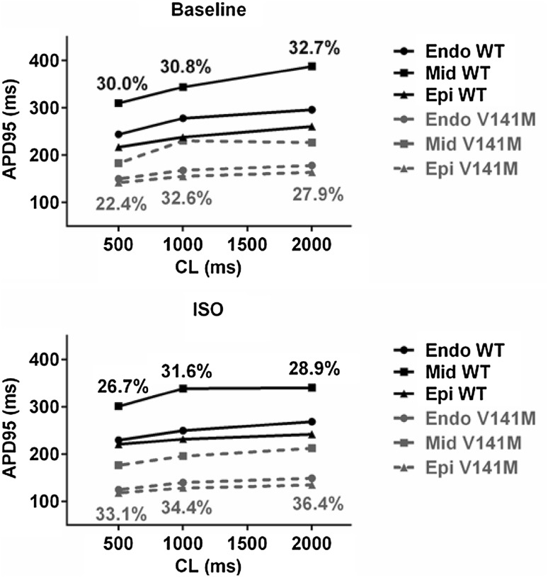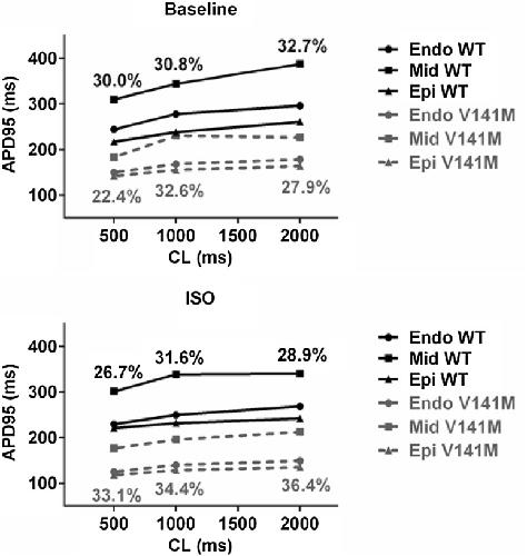 Fig. 3. AP simulations show blunted APD rate adaptation and increased transmural heterogeneity of APD associated with the V141M KCNQ1 mutation. At fast cycle lengths of 500 ms and slow cycle lengths of 2000 ms, WT KCNQ1 APD increased 52.0, 77.6, and 43.5 ms in Endo, Mid and Epi, respectively, but V141M KCNQ1 mutation APD increased 28.3, 43.7, and 21.5 ms respectively (upper panel). At cycle lengths of 500 and 2000 ms, APD heterogeneity diminished from 30.0 to 26.7% and from 32.7 to 28.9% respectively in the presence of isoproterenol (ISO) challenge in WT. In contrast, the heterogeneity of APD was augmented with ISO in V141M KCNQ1. In the presence of ISO, APD heterogeneity increased from 22.4 to 33.1%, from 27.9 to 36.4%, and from 32.6 to 34.4%, at cycle lengths of 500, 2000, or 1000 ms, respectively. The heterogeneity increase was due to preferential abbreviation of epicardial (Epi) and endocardial (Endo) cells as compared with mid-myocardial (Mid) cells