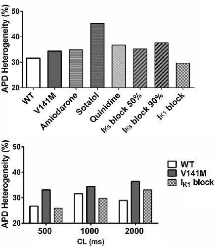 Fig. 4. Effects of different anti-arrhythmic agents or channel blockers on the V141M KCNQ1-augmented transmural heterogeneity of APD. At a cycle length of 1000 ms with isoproterenol (ISO) (upper panel), amiodarone, sotalol, quinidine and IKs block (either at 50 or 90% block) all failed to reduce the mutation-augmented transmural heterogeneity of APD (upper panel). Only the IK1 block (with 90% block) improved APD heterogeneity at both long and short cycle lengths under ISO challenge (lower panel)