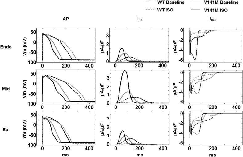 Fig. 2. Simulated WT and heterozygous V141M KCNQ1 action potentials (AP) and the IKs and ICaL during the AP in endocardial (Endo), epicardial (Epi) and midmyocardial (Mid) myocytes with and without isoproterenol (ISO). A modified O’Hara-Rudy (ORd) human ventricular myocyte model was used in the simulations. The cycle length was 1000 ms. Baseline APs (in grey) and APs with ISO challenge (in black) were simulated for WT (dash lines) and V141M KCNQ1 (solid lines) respectively. APs were shortened significantly by the V141M KCNQ1 mutation with and without ISO. In all V141M cases, IKs and ICaL increased relative to WT during the AP