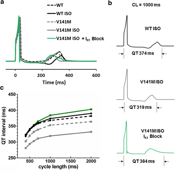 Fig. 5. Effects of IK1 blockade on the pseudo-ECG and QT interval. a Pseudo-ECGs at a cycle length of 1000 ms for WT and V41M KCNQ1 mutation, at baseline and with isoproterenol, and with 90% IK1 block. b QT interval measurements for each pseudo-ECG are indicated. c QT intervals on the pseudo-ECG are plotted against the cycle length. In the case of V141M, the QT interval was abnormally shortened with ISO; the shortening of the QT interval was corrected by specific IK1 blockade. ECG electrocardiogram, WT wild type, V141M V141M KCNQ1 mutation