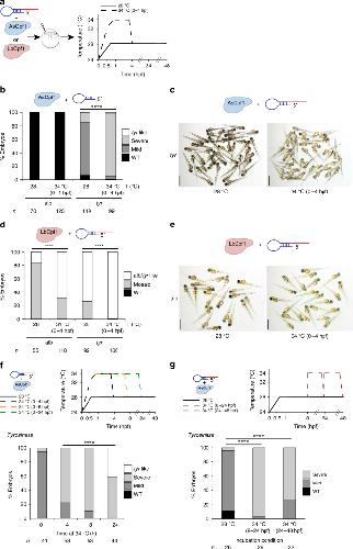 Fig. 2. Temperature is a key factor modulating Cpf1 activity in vitro and in vivo. a Schema illustrating different temperature incubations after Cpf1âcrRNA RNP complex injections targeting slc45a2 (alb) and tyr. b Phenotypic evaluation of AsCpf1âcrRNA RNP complex (10âfmol) injections at different temperature incubations (T). Stacked barplots showing the percentage of tyr-like (white), severe mutant (light gray), mild mutant (dark gray), and phenotypically WT (black) embryos 48âhpf after injection. Number of embryos evaluated (n) is shown for each condition. Ï 2-test (****pâ<â0.0001). c A representative picture showing 48-hpf-old embryos obtained after AsCpf1âcrRNA RNP complex injections targeting tyr at different temperature incubations. Scale bar, 1.25âmm. d Phenotypic evaluation of LbCpf1âcrRNA RNP complex (10âfmol) injections at different temperature incubations (T). Stacked barplots showing the percentage of alb/tyr-like (white), mosaic mutants (gray), and phenotypically WT (black) embryos 48âhpf after injection. Number of embryos evaluated (n) is shown for each condition. Ï 2-test (****pâ<â0.0001). e A representative picture showing 48-hpf-old embryos obtained after LbCpf1âcrRNA RNP complex injections targeting slc45a2 at different temperature incubations. Scale bar, 1.25âmm. f Schematic illustrating different incubation conditions (0, 4, 8, or 24âh at 34â°C, then at 28â°C) after AsCpf1âcrRNA RNP complex (10âfmol) injections targeting tyr in zebrafish (top). Phenotypic evaluation of AsCpf1âcrRNA RNP complex injections targeting tyr in the conditions described above (bottom). Stacked barplots showing the percentage of tyr-like (white), severe mutant (light gray), mild mutant (dark gray), and phenotypically WT (black) embryos 48âhpf after injection. Number of embryos evaluated (n) is shown for each condition. Ï 2-test (****pâ<â0.0001). g Schematic illustrating different incubation conditions: 8âh at 28â°C, 16âh at 34â°C, and then 24âh at 28â°C (34â°C 8â24âhpf) or 24âh at 28â°C, then 24âh at 34â°C (34â°C 24â48âhpf) after AsCpf1âcrRNA RNP complex (10âfmol) injections targeting tyr in zebrafish (top). Phenotypic evaluation of AsCpf1âcrRNA RNP complex injections targeting tyr in the conditions described above (bottom). Stacked barplots showing the percentage of severe mutant (light gray), mild mutant (dark gray), and phenotypically WT (black) embryos 48âhpf after injection. Number of embryos evaluated (n) is shown for each condition. Ï 2-test (****pâ<â0.0001) |