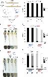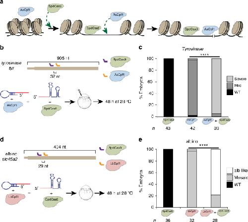 Fig. 3. Catalytic dead SpCas9 (SpdCas9) proximal targeting increases Cpf1 activity. a Schematic diagram of proxy-CRISPR approach. Temperature may control Cpf1 activity to access and/or unwind genomic DNA, impeding AsCpf1 to access the genomic target in vivo at 28â°C. When SpdCas9 binds in the proximity of the AsCpf1 target, it facilitates the availability of AsCpf1 to cleave the inaccessible target. b Diagram illustrating crRNA 1 (orange) and a proximal sgRNA (purple) targeting tyr exon 1 (Supplementary Fig. 10c and Supplementary Data 1) in zebrafish (top). AsCpf1âcrRNA and/or SpdCas9-sgRNA RNP complexes were injected into one-cell-stage embryos and then incubated at 28â°C for 48âh (bottom). c Phenotypic evaluation of the experiment described in (b). Stacked barplots showing the percentage of severe mutant (light gray), mild mutant (dark gray), and phenotypically WT (black) embryos 48âhpf after injection. Number of embryos evaluated (n) is shown for each condition. Ï 2-test (****pâ<â0.0001). d Diagram illustrating crRNA 2 (orange) and sgRNA 2 (purple) targeting alb exon 1 (Supplementary Data 1, Supplementary Figs. 3f and 8e) in zebrafish (top). LbCpf1âcrRNA and/or SpdCas9-sgRNA RNP complexes were injected into one-cell-stage embryos and then incubated at 28â°C for 48âh (bottom). e Phenotypic evaluation of the experiment described in (d). Stacked barplots showing the percentage of alb-like (white), mosaic mutants (gray) and phenotypically WT (black) embryos 48âhpf after injection. Number of embryos evaluated (n) is shown for each condition. Ï 2-test (****pâ<â0.0001) |