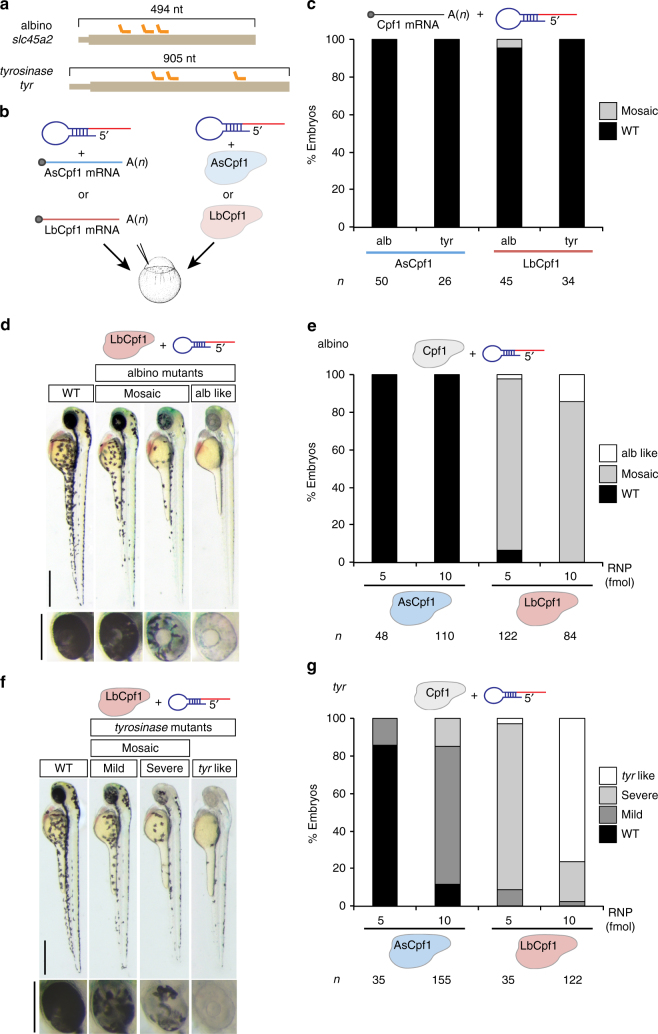 Fig. 1. LbCpf1âcrRNA RNP complexes are a robust genome editing system in zebrafish. a Diagram illustrating three crRNAs (orange) targeting slc45a2 and tyr exon 1 in zebrafish. b Schematic illustrating the experimental set-up to analyze CRISPR-Cpf1-mediated mutations in zebrafish. Three crRNAs (a) were either mixed with mRNA coding for AsCpf1 or LbCpf1 or assembled into RNP complexes with their corresponding purified proteins and injected in one-cell-stage embryos. c Phenotypic evaluation of crRNAs (30âpg/crRNA) and mRNA (100âpg) injections. Stacked barplots showing the percentage of mosaic (gray) and phenotypically wild-type (WT; black) embryos 48âh post fertilization (hpf) after injection. d Phenotypes obtained after the injection of the LbCpf1âcrRNA RNP complexes targeting slc45a2 showing different levels of mosaicism compared to the WT. Lateral views (scale bar, 0.5âmm) and insets of the eyes (scale bar, 0.25âmm) of 48âhpf embryos are shown. e Phenotypic evaluation of Cpf1âcrRNA RNP complexes injections targeting slc45a2 (albino). Stacked barplots showing the percentage of alb-like (white), mosaic (gray), and phenotypically WT (black) embryos 48âhpf after injection using different amounts (fmol) of RNP complexes. Number of embryos evaluated (n) is shown for each condition. f Phenotypes obtained after the injection of the LbCpf1âcrRNA RNP complexes targeting tyr showing different levels of mosaicism compared to the WT. Lateral views (scale bar, 0.5âmm) and insets of the eyes (scale bar, 0.25âmm) of 48âhpf embryos are shown. g Phenotypic evaluation of Cpf1âcrRNA RNP complexes targeting tyrosinase (tyr). Stacked barplots showing the percentage of tyr-like (white), severe mutant (light gray), mild mutant (dark gray), and phenotypically WT (black) embryos 48âhpf after injection using different amounts (fmol) of RNP complexes. Number of embryos evaluated (n) is shown for each condition |