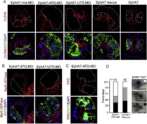 Fig. 2. EphA7 regulates tight junction related proteins. (A) Immunostaining of CLDN6 (red) on sections of pronephric tubules of stage 35 embryos injected with EphA7-mis-MO, EphA7-UTR-MO, EphA7-ATG-MO, EphA7-ATG-MO plus EphA7 mRNA (175 pg EphA7 rescue) or EphA7 mRNA alone. The targeted areas labeled by tracing GFP (green) are outlined. (B) Immunostaining of Na/K-ATPase (red) on sections of pronephric tubules of stage 35 embryos injected with EphA7-ATG-MO or EphA7-UTR-MO. The targeted areas labeled by tracing GFP (green) are outlined. (C) Immunostaining of PKCζ (red) on sections of pronephric tubules of stage 35 embryos injected with EphA7-ATG-MO. The targeted areas labeled by tracing GFP (green) are outlined. (D) Co-expression of CLDN6.1 (170 pg) partially rescued the fusion-nephrostome phenotype in EphA7-ATG-MO injected embryos, as indicated by in situ hybridization using a Pax2 probe. (For interpretation of the references to colour in this figure legend, the reader is referred to the Web version of this article.)