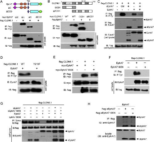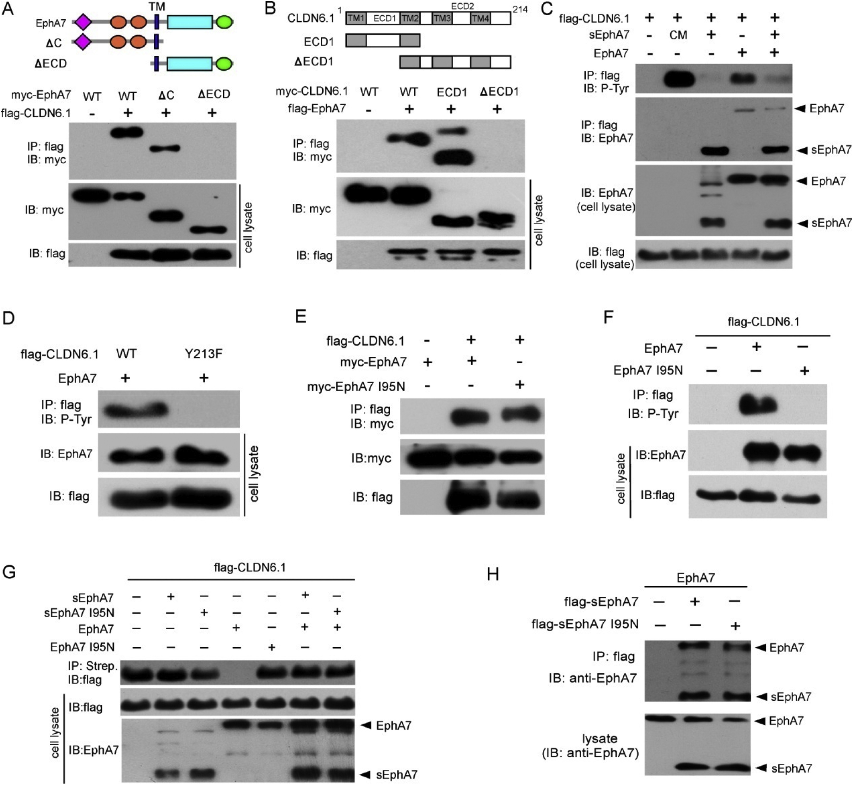 Fig. 4. EphA7 phosphorylates CLDN6 and regulates its membrane localization. (A, B) EphA7 and CLDN6 interact through their extracellular domains. The indicated EphA7 and CLDN6.1 constructs were co-transfected into HEK293 cells and processed for co-immunoprecipitation assays. The structures of the EphA7 and CLDN6.1 truncates are shown in the upper panels. TM, transmembrane domain; ECD, extracellular domain. (C) EphA7 phosphorylates CLDN6.1 which was inhibited by co-expressed sEphA7. HEK 293 cells were transfected as indicated, the cell lysates were immunoprecipitated and blotted with anti-phosphotyrosine, anti-flag or anti-EphA7 antibodies. Note that sEphA7 was pulled down efficiently by CLDN6.1. When the CLDN6.1 transfected cells were treated with sEphA7 conditioned medium (CM) for 1 h, robust phosphorylation of CLND6.1 was observed. (D) Immunoprecipitation assay showing that the mutated version of flag-CLDN6.1 (Y213F) was no longer phosphorylated by EphA7. (E, F) The ephrin ligand binding deficient EphA7 I95 N can bind but not phosphorylate CLDN6.1. (G) EphA7 reduced membrane CLDN6.1, which was reversed by sEphA7. HEK 293 cells were transfected as indicated, the cell surface proteins were labeled with biotin. The cell lysates were then immunoprecipitated with Streptavidin beads and immunoblotted with anti-flag or anti-EphA7 antibodies. (H) sEphA7 and sEphA7 I95 N bind EphA7 in co-IP assays.