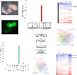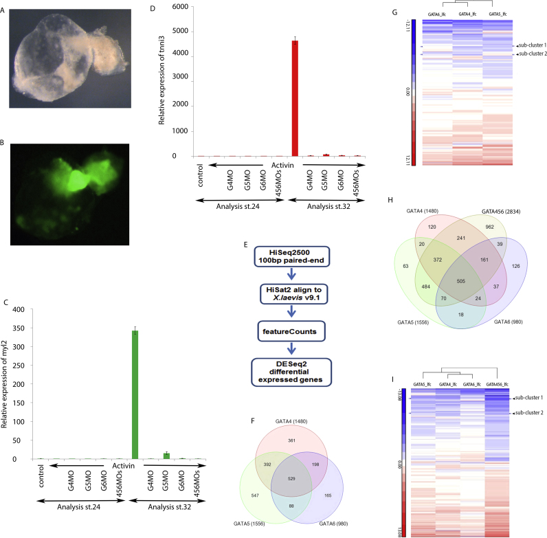 Fig. 1. Activin-induced cardiac explants as cardiogenic assay to screen for genes specifically regulated by cardiogenic gata genes. Activin-injected animal caps from myl2-GFP reporter Xenopus laevis transgenic line were cultured until stage 45 and photographed in bright field (A) or with GFP filter (B) allowing visualisation of myl2-expressing cells throughout the beating explant. Total RNA was extracted from stage 32 wild-type Xenopus laevis explants injected with either Activin (Act) alone or together with gata4, 5 or 6 morpholinos (MOs) for real-time RT-PCR monitoring of myl2 (C) or tnni3 (D) expression. Following validation, samples were subjected to high-throughput sequencing where (E) represents schematic pipeline of RNA-seq bioinformatics analysis and (F, H) Venn diagrams of numbers of genes that are differentially expressed compared to Activin-injected control with at least a two-fold reduction in expression and an adjusted p value of<0.05. (G, I) Heatmaps of fold changes for differentially expressed genes (increased or decreased expression without any fold-change threshold applied) highlighting sub-clusters that are specifically regulated by gata4. Abbreviations: control, uninjected explant; G4MO, G5MO, G6MO and 456MOs representing respectively gata4, gata5, gata6 and all three combined morpholinos. Genes in sub-clusters 1 and 2 are listed in Fig. S1B, C. |