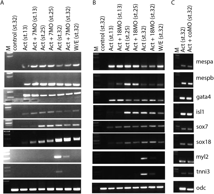 Fig. 2. sox7 and sox18 are required for Activin-induced cardiac differentiation. Semi-quantitative RT-PCR assay monitoring cardiogenic gene expression (as indicated) in animal cap explants injected with Activin alone or in combination with sox7 and sox18 MOs, analysed at control stages 13, 25 and 32. Note that pronounced sox7 and sox18 expression starts after expression of cardiac progenitor markers mespa, mespb, and the early cardiac marker gata4. Note also that MO-mediated knockdown of sox7 or sox18 affect cardiac differentiation, as monitored by induction of cardiac differentiation markers myl2 and tnni3. M, Molecular size marker; control, uninjected explant; CoMO, control MO; 7MO, sox7 MO; 18MO, sox18MO; W/E, whole embryo; odc, ornithine decarboxylase (internal loading control). |