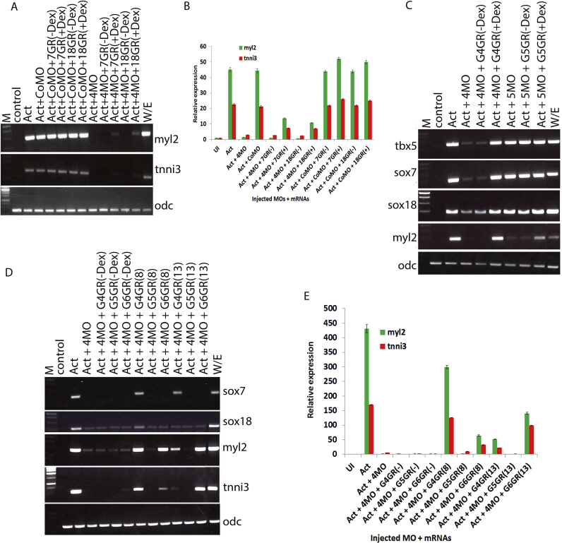 Fig. 4. sox7 and sox18 are essential downstream mediators of gata4 during cardiomyogenesis. Activin-induced cardiac explants injected with control, gata4 or gata5 MOs together with mRNA encoding inducible sox7 (7GR), sox18 (18GR) or gata proteins (G4GR, G5GR and G6GR), as indicated, which were activated before gastrulation (8, stage 8) (A to C) and during late gastrula (13, stage 13), as indicated (D and E). Semi-quantitative (A, C and D) and quantitative (B and E) RT-PCR assay monitoring indicated markers analysed at control stage 32. Note the partial recovery (A, B) of the effect of gata4 inhibition on cardiac differentiation by experimentally activated SoxF proteins (7GR and 18GR). Note also that only gata4 knock down affects sox7 and sox18 expression and that only gata4 when reinstated can recover sox7 and sox18 expression. Note further the stage-dependent different intrinsic cardiac inducing properties of the three cardiogenic gata paralogs (as revealed by expression of cardiac differentiation markers myl2 and tnni3). Abbreviations are same as in previous figures. 200 pg and 1000 pg of mRNA were injected for overexpression of sox and gata proteins respectively. |