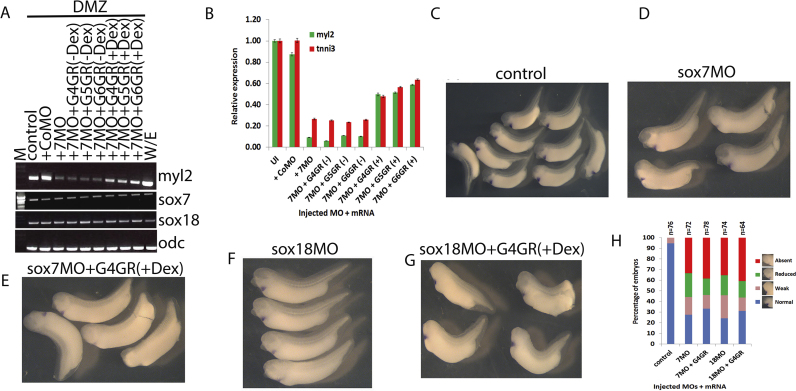 Fig. 5. sox7 and sox18 are required for endogenous cardiac differentiation in vivo. Semi-quantitative (A) and quantitative (B) RT-PCR analyses of cardiac differentiation (myl2 expression) in Xenopus stage 32 dorsal marginal zone (DMZ) explants injected with sox7 MO together with 200Â pg of mRNAs encoding dexamethasone-inducible gata proteins, as indicated. Note considerable requirement of sox7 function for cardiac differentiation (myl2 expression) and the ability of experimentally activated gata4, 5 or 6 to cause only a partial recovery of cardiac differentiation in a sox7 knockdown (compare with Activin-induced cardiomyogenesis, see Fig. 3H and I). (C - G) Whole-mount in situ hybridisation analysis of tnni3 expression of stage 32 embryos which are either uninjected (C) or had been injected at the four-cell stage in the two dorsal blastomeres with sox7 MO (D), sox7 MO plus gata4GR mRNA (E), sox18 MO (F) or sox18 MO plus gata4GR mRNA (G). Dexamethasone was added at stage13 to activate the inducible gata4 protein (in E and G). Note that embryos with depleted sox7 and sox18 have reduced tnni3 expression compared to wild type (C) ranging from weak to complete reduction (D and F), which cannot be recovered with activated gata4 proteins (E and G). (H) Quantified data of tnni3 expression in each condition. |