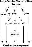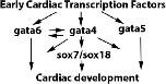 Fig. 7. Proposed model to depict the functional differences between cardiogenic gata paralogs during cardiomyogenesis. The SoxF paralogs sox7 and sox18 mediate gata4 but not gata5 and gata6 function during cardiomyogenesis. All cardiogenic gata function after induction of early cardiac transcription factors where sox7 and sox18 act downstream to mediate only some of gata4 but not gata5 and gata6 function during cardiomyogenesis (for details, see text in Discussion Sections). ×1? and ×2? indicate yet unidentified intermediary factors. |