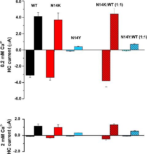 Figure 1. Functional expression of N14K and N14Y hemichannels. Bar graphs show mean values of hemichannel (HC) currents measured in Xenopus oocytes at a holding potential of â40 mV and at the end of a 10-s voltage step to 40 mV. Measurements were obtained in 100 mM NaCl containing 0.2 mM Ca2+ (top) or 2.0 mM Ca2+ (bottom). N14K produced robust currents comparable with WT Cx26 in 0.2 mM Ca2+. Currents were substantially inhibited in 2 mM Ca2+. N14Y produced very small currents at both Ca2+ concentrations, particularly when measured at â40 mV, which were barely detectable above baseline. N14K and N14Y, each co-injected with WT Cx26 in a 1:1 ratio, showed similar differential levels of expressed currents. All oocytes were injected with the same concentration of total RNA. Measurements were obtained between 24 and 48 h, after injection. Each bar represents the mean ± SEM obtained at â40 mV and 40 mV. In 0.2 mM Ca2+: WT Cx26, n = 7; N14K, n = 13; N14Y, n = 11; N14K:WT, n = 8; N14Y:WT, n = 10. In 2 mM Ca2+: WT Cx26, n = 12; N14K, n = 9; N14Y, n = 19; N14K:WT, n = 6; N14Y:WT, n = 19. |