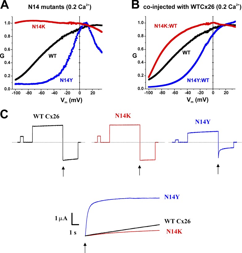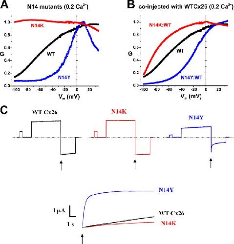 Figure 3. N14K and N14Y likely affect the stabilization of the open state for the loop gating mechanism. (A and B) Superimposition of the normalized G-V curves in 0.2 mM Ca2+ for WT and for the two mutants N14K and N14Y, expressed alone (A) and together with WT Cx26 in 1:1 ratios (B), shows the opposite shifts in activation caused by the two mutants. Data in A is the same as in Fig. 2. Error bars were omitted for clarity. N14K:WT, n = 5; N14Y:WT, n = 6; WT, n = 5. (C) Examples of deactivation kinetics for WT Cx26, N14K, and N14Y hemichannels. Cells were stepped to 40 mV for 16 s to activate hemichannels and then stepped to â100 mV (at arrows) to examine deactivation. Currents were superimposed at their peaks. N14Y currents deactivated rapidly compared with WT Cx26. N14K did not show appreciable deactivation. |