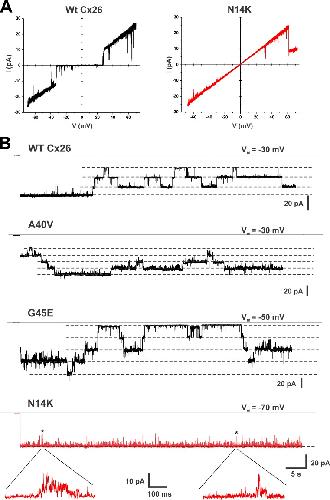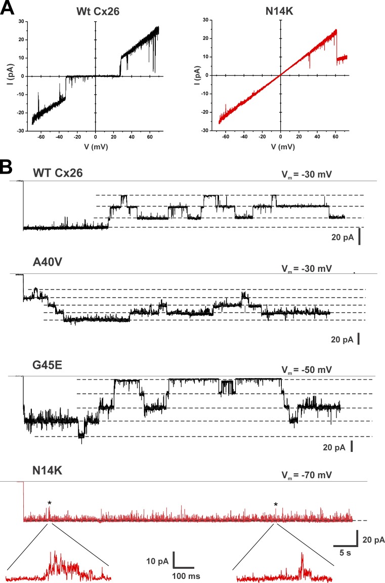 Figure 4. Single N14K hemichannel recordings show a stably open configuration. (A) Representative examples of patch clamp recordings from inside-out patches containing single WT Cx26 and N14K hemichannels. Currents shown were obtained in response to 8-s voltage ramps applied between 70 and â70 mV and leak subtracted (see Materials and methods). N14K is indistinguishable from WT Cx26 in terms of slope conductance (measured at 0 mV) and slight outward rectification. Bath and pipette solutions consisted of IPS (see Materials and methods). (B) Examples of patch clamp recordings of WT Cx26 hemichannels and three KID mutants, A40V, G45E, and N14K. Patches contained two or more active hemichannels. At the beginning of each trace, the membrane potential was stepped from 0 mV to the value indicated. WT Cx26, A40V, and G45E all showed active loop gating events throughout. N14K (red trace) showed a clear difference from the other hemichannels, essentially remaining open with no evidence of stable loop gating closures, consistent with stabilization of the open configuration for this gating mechanism. Examples of expanded views of the brief flickers (at asterisks) show them to be poorly resolved, noisy fluctuations in current that do not reach a steady level. Solid lines are the currents at 0 mV (designated I = 0). Dashed lines indicate open hemichannel current levels. The records were not leak subtracted. All currents were filtered at 1 kHz, and data were acquired at 5 kHz. |