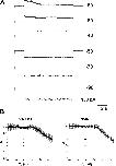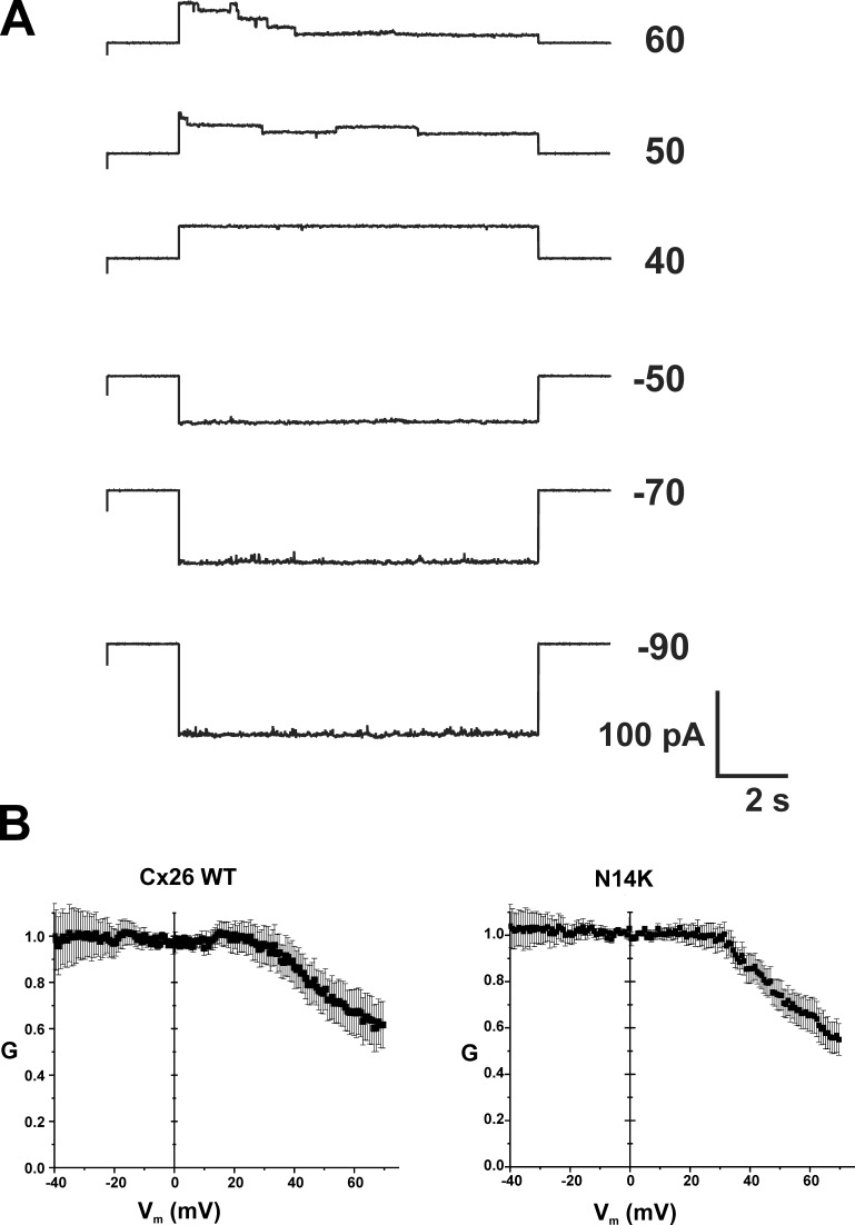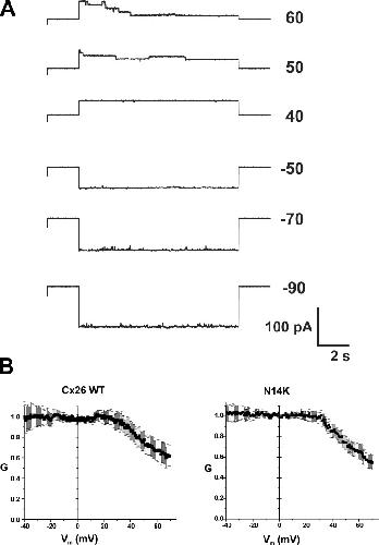 Figure 5. The N14K mutation selectively affects the loop gating mechanism. (A) Representative cell-attached patch recording containing several N14K hemichannels. Pipettes contained IPS so that Ca2+ was buffered to submicomolar levels. The patch was stepped to voltages ranging from â90 to 60 mV for 10 s. No gating was evident with hyperpolarizing steps, but gating to subconductance states was evident on depolarizing steps characteristic of the Vj or fast gating mechanism. (B) G-V relationships at positive voltages were constructed from voltage ramps applied to patches containing one or two active hemichannels. For WT Cx26 and N14K, currents were each averaged from 50 to 60 ramps taken from eight different oocytes. The G-V curves at positive membrane voltages appear similar for WT and N14K. Error bars are ±SEM. All currents were filtered at 1 kHz, and data were acquired at 5 kHz. |