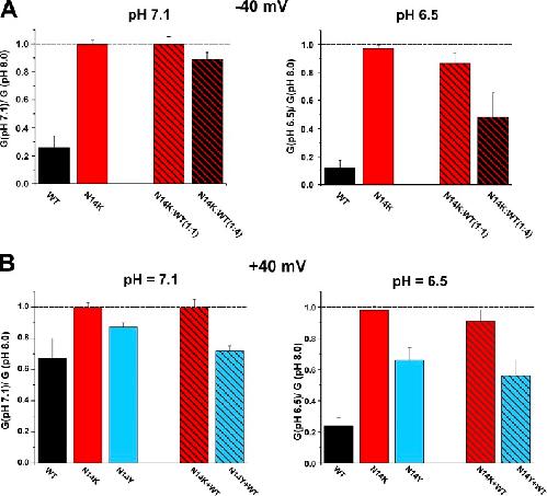 Figure 6. The N14K mutation is insensitive to pH. The bar graphs show ratios of macroscopic conductances relative to pH 8.0 in solutions adjusted to pH 7.1 and 6.5. (A) Conductances were calculated from oocytes held at â40 mV. Data are shown for WT Cx26, N14K, and N14K co-injected with WT Cx26 (N14K:WT) in ratios of 1:1 and 1:4. N14K hemichannels were insensitive to either pH 7.1 or 6.5. Hemichannel currents recorded from cells co-injected in a 1:1 ratio also were largely refractory to inhibition by pH, whereas those co-injected in a 1:4 ratio showed weakened but progressive reductions with pH 7.1 and 6.5. WT Cx26, n = 6; N14K, n = 4; N14K:WT (1:1), n = 9; N14K:WT (1:4), n = 4. (B) N14Y currents are small at negative membrane voltages, and so the effects of pH were assessed for this mutant at 40 mV. Data are shown for WT Cx26, N14K, N14Y, and each mutant co-injected with WT Cx26 in a 1:1 ratio (N14K + WT and N14Y + WT). N14K hemichannels remained insensitive to pH. N14Y showed reduced sensitivity that was intermediate between WT and N14K. WT Cx26, n = 4; N14K, n = 4; N14Y, n = 5; N14K + WT (1:1), n = 4; N14Y:WT (1:4), n = 5. Each bar represents the mean ratio ± SEM. |