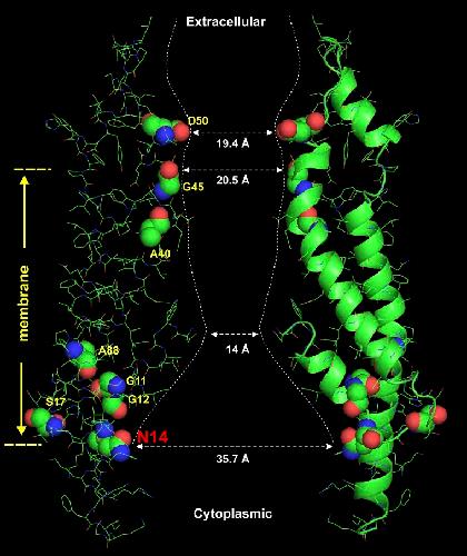 Figure 7. Positions of N14 and other KID mutants in the Cx26 structure. Representation of two of six subunits (in green) around a central aqueous pore from the atomic structure of Cx26 (Protein Data Bank accession no. 2ZW3; Maeda et al., 2009). The structure is displayed using the PyMOL Molecular Graphics System (version 1.8; Schrödinger, LLC). For clarity, the Cx26 sequence shown is truncated at residue G109 near the border of the cytoplasmic TM2 extension and the cytoplasmic loop. KID mutant residues are shown as spherical renditions. The gross shape of the pore is illustrated by the dashed lines, with approximate dimensions of the pore diameter at various positions. The approximate membrane boundary is indicated. In this structure, N14 is situated in the wide cytoplasmic vestibule of the hemichannel. |
