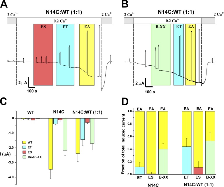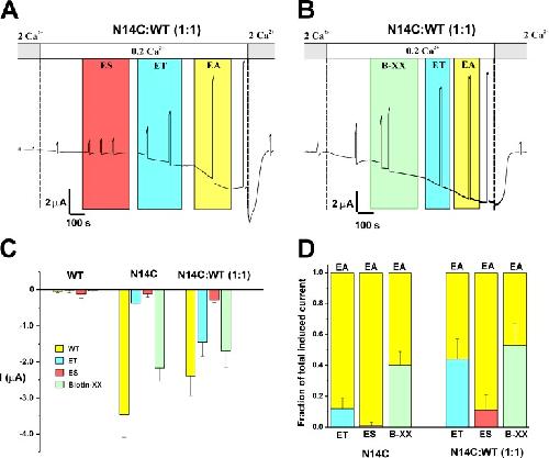 Figure 9. Effects of MTS reagents on Cx26 hemichannels containing N14C subunits. (A) Bath application of the negatively charged MTSES reagent (ES) to a cell co-injected with N14C and WT Cx26 in a 1:1 ratio did not significantly affect current. Subsequent actions of MTS reagents were not affected. (B) Bath application of MTSEA biotin-XX to cells co-injected with N14C and WT Cx26 in a 1:1 ratio induced current. Subsequent actions of MTSET and MTSEA were attenuated. (C) Bar graph summarizing the effects of MTS reagents on oocytes injected with N14C and N14C + WT (1:1). Values represent the mean change in current in 0.2 mM Ca2+ after a 3-min exposure to MTSEA (yellow), MTSET (cyan), MTSES (red), and MTS biotin-XX (green). Error bars represent ±SEM; the number of oocytes tested ranged from five to nine. (D) Bar graph summarizing the effect of MTSET, MTSEA, or MTS biotin-XX application on a subsequent MTSEA application. MTSET, MTSEA, or MTS biotin-XX was applied for 3 min and followed by exposure to MTSEA for 3 min. The current after exposure to MTSEA was designated as the total current. Colored portions of each bar represent the fraction of the total current produced by the indicated MTS reagent. Co-injected oocytes show an increase in the fraction of the total current produced by MTSET or MTS biotin-XX, indicating that the N14C subunit is modified, leaving less available for subsequent MTSEA modification. Values represent mean ± SEM; the number of oocytes ranged from 6 to 10. MTS reagents were designated as ET for MTSET, EA for MTSEA, ES for MTSES, and B-XX for MTSEA biotin-XX. |