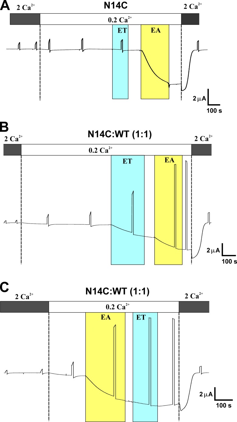 Figure 8. Substituted cysteine accessibility supports exposure of N14 to the aqueous pore. (AâC) Shown are effects of MTSEA and MTSET on macroscopic currents recorded from oocytes expressing N14C alone (A) or co-injected with WT Cx26 (B and C). Oocytes were bathed in a simple 100 mM NaCl salt solution containing the indicated Ca2+ concentrations and held at â40 mV throughout except for periodic steps to 40 mV to assess hemichannel activation at a positive voltage. (A) Responses of N14C to MTSET and MTSES. Bath application of MTSET showed little or no effect, whereas subsequent application of MTSEA produced a large induction of current. (B) The same experiment as in A, except it was performed in a cell co-injected with N14C and WT Cx26 in a 1:1 ratio. Bath application of MTSET induced an increase in current, and the subsequent action of MTSEA was attenuated. (C) In a cell co-injected with N14C and WT Cx26 in a 1:1 ratio, bath application of MTSEA induced a large current that occluded the subsequent action of MTSET, indicating that the same site is modified by both reagents and that MTSEA modifies all available sites. MTS reagents are designated as ET for MTSET and EA for MTSEA. |