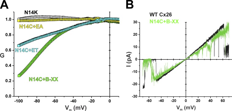 Figure 10. Effects of MTS reagents on Cx26 hemichannels containing N14C subunits on gating and unitary conductance. (A) Superimposed normalized G-V relationships of N14K hemichannels (open symbols) and N14C hemichannels modified by MTSEA (yellow symbols), MTSET (cyan symbols), and MTSEA biotin-XX (green symbols). Recordings were performed in 0.2 mM Ca2+. MTS reagents were applied for 10 min before obtaining the G-V relationships via slow (600 s) voltage ramps between 40 and â100 mV from a holding potential of â20 mV. Data points represent mean values. Error bars were omitted for clarity. N14C + MTSEA, n = 3; N14C + MTSET, n = 4; N14C + MTSEA biotin-XX, n = 5. Data for N14K is the same as in Fig. 2. (B) Superimposed patch clamp recordings from cell-attached patches containing a single WT Cx26 hemichannel and a single N14C hemichannel modified by MTSEA biotin-XX. Currents were obtained by applying 8-s voltage ramps between 70 and â70 mV and leak subtracted (see Materials and methods). The N14C hemichannel modified by MTSEA biotin-XX was only slightly reduced in conductance and exhibited a noisier and a more flickery open hemichannel current. Bath and pipette solutions consisted of IPS (see Materials and methods). Data were acquired at 5 kHz and filtered at 1 kHz. MTS reagents were designated as ET for MTSET, EA for MTSEA, and B-XX for MTSEA biotin-XX. |