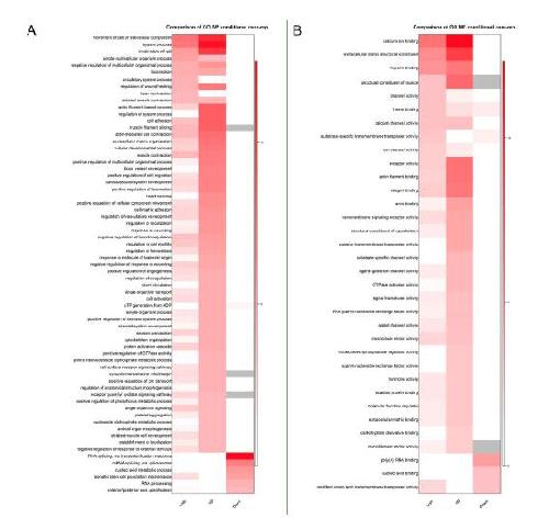 Fig. 4. GO of significantly changed RNAs between mMO injected and control embryos. A: Heat maps of –log10 (P-values) showing the comparison of all significantly changed (both), up- or down-regulated gene sets from X. laevis for BP category. Due to the larger number of BP terms, only those with raw P-values<0.0001 in any gene set were included in the heat map. B: Heat maps of –log10 (P-values) showing the comparison of all (both), up or down gene sets from X. laevis for MF category. GO terms with raw P-values<0.001 in any gene set were included for MF. |